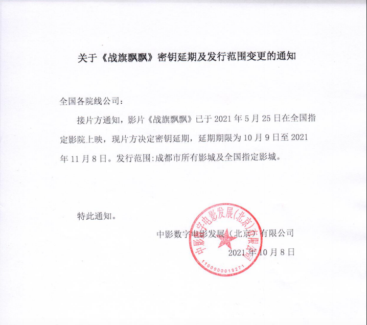 《战旗飘飘》密钥延期通知及发行范围变更的通知