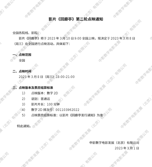 《回廊亭》第二轮点映的通知