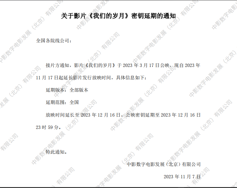 《我们的岁月》第十五次密钥延期的通知
