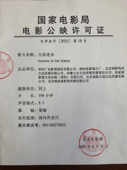 出 品:深圳广电影视股份有限公司、深圳电影制片厂、北京国影鸣尚文化传媒有限公司、安徽九合文化传媒有限责任公司、何家班影视文化传媒(深圳)有限公司、北京泷帆文创文化传媒有限公司、北京辣条屋影视传媒有限公司