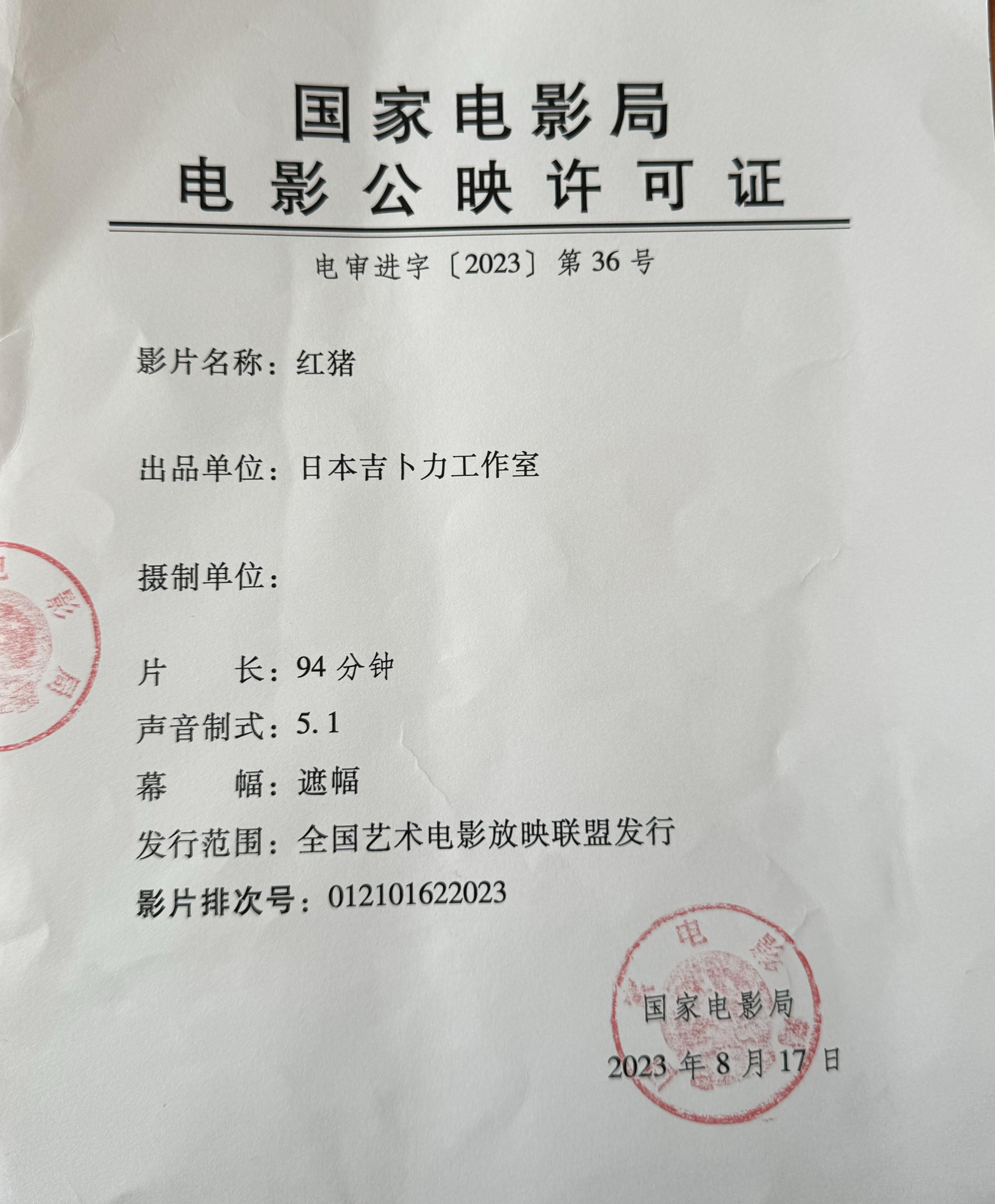 《红猪》发行通知(延期)