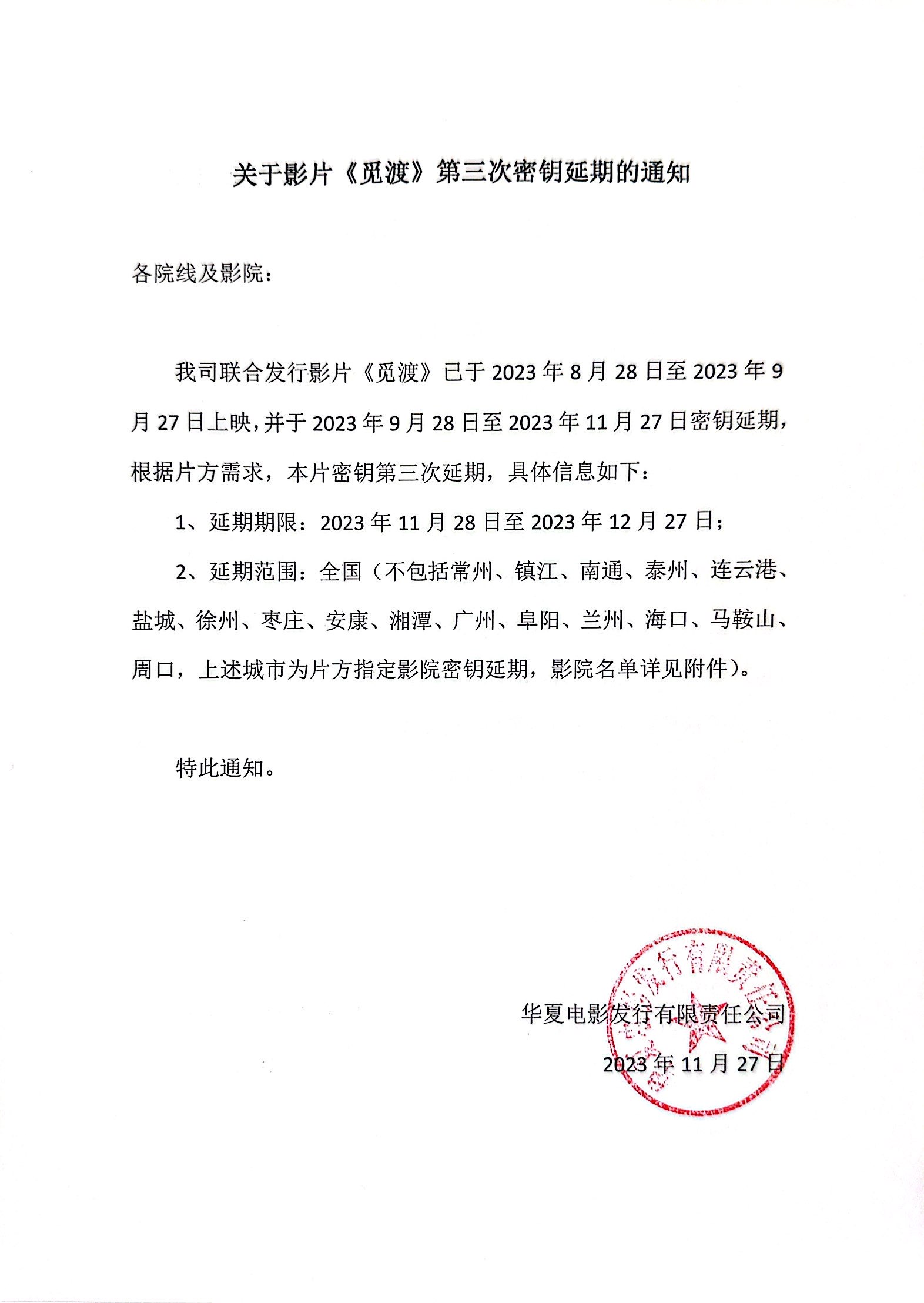《觅渡》第二次变更上映范围的通知