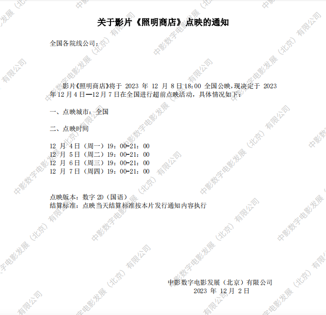 关于影片《照明商店》第二次密钥延期的通知