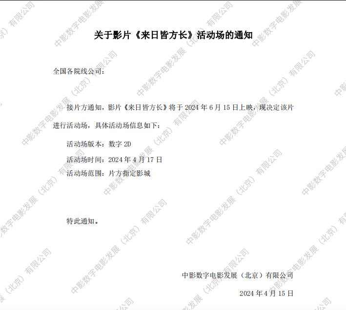 《来日皆方长》发行范围变更的通知