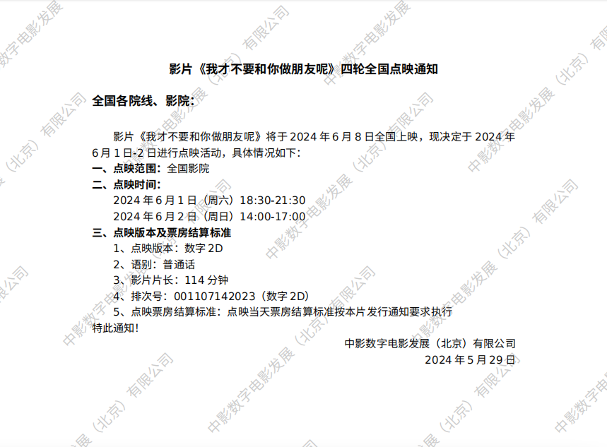 《我才不要和你做朋友呢》第五轮全国点映的通知