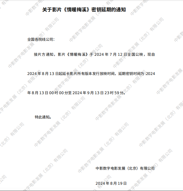 关于影片《情暖梅溪》二次密钥延期的通知