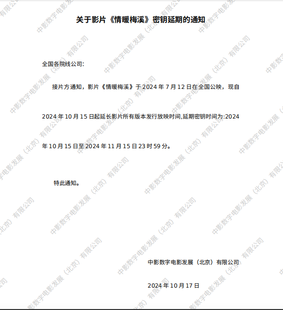 关于影片《情暖梅溪》二次密钥延期的通知