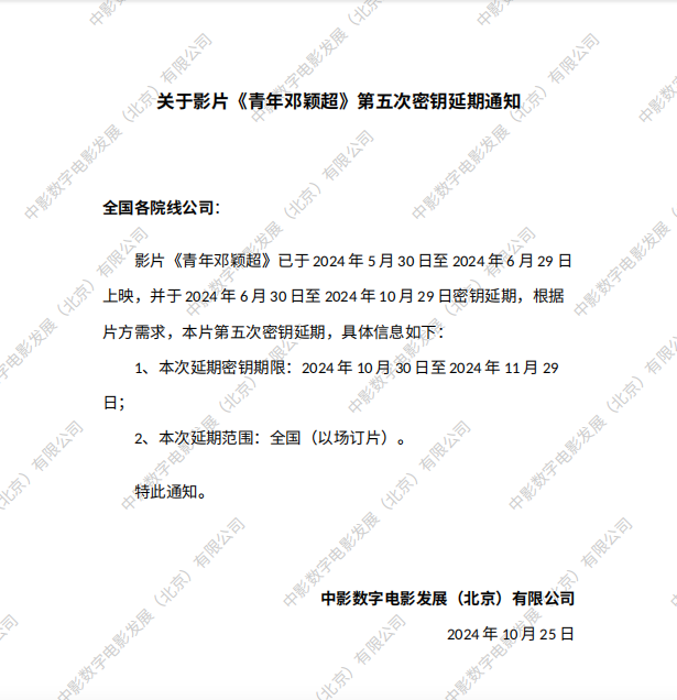 《青年邓颖超》第十次密钥延期的通知