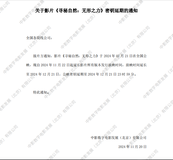 《寻秘自然:无形之力》调整票房结算标准的通知