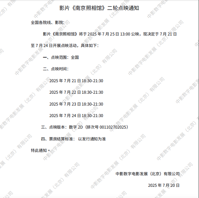 《南京照相馆》第二轮点映的通知