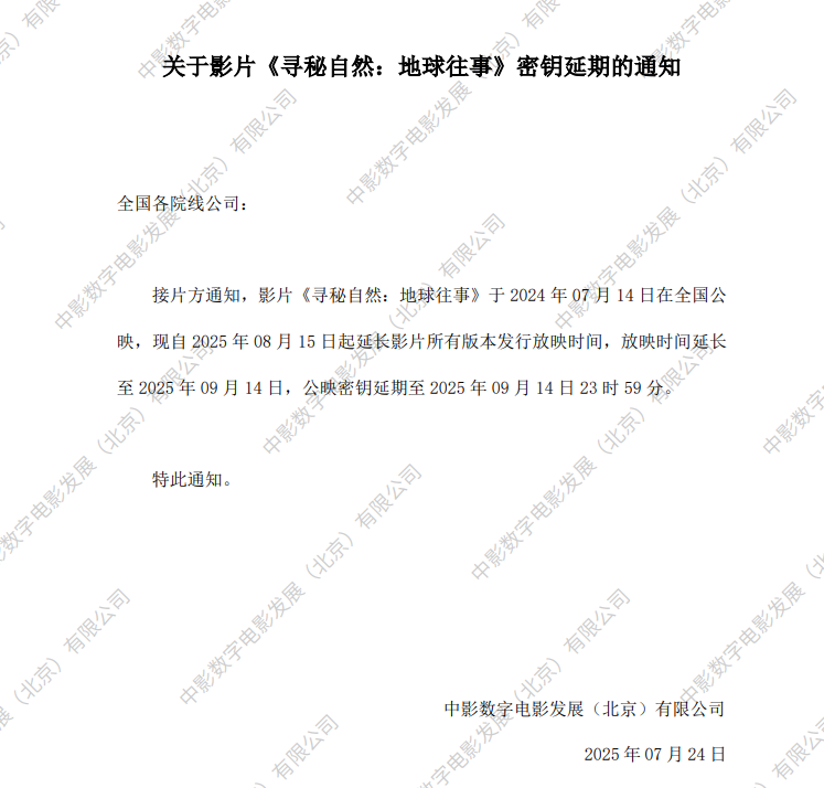 关于影片《寻秘自然:地球往事》15次密钥延期的通知