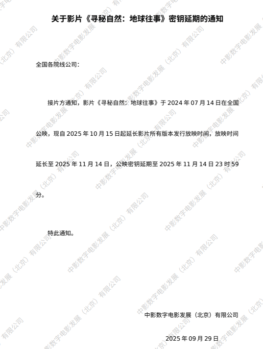 关于影片《寻秘自然:地球往事》13次密钥延期的通知