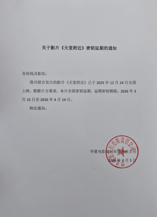 发行通知 » 致院线-关于影片《天堂附近》全国密钥延期通知