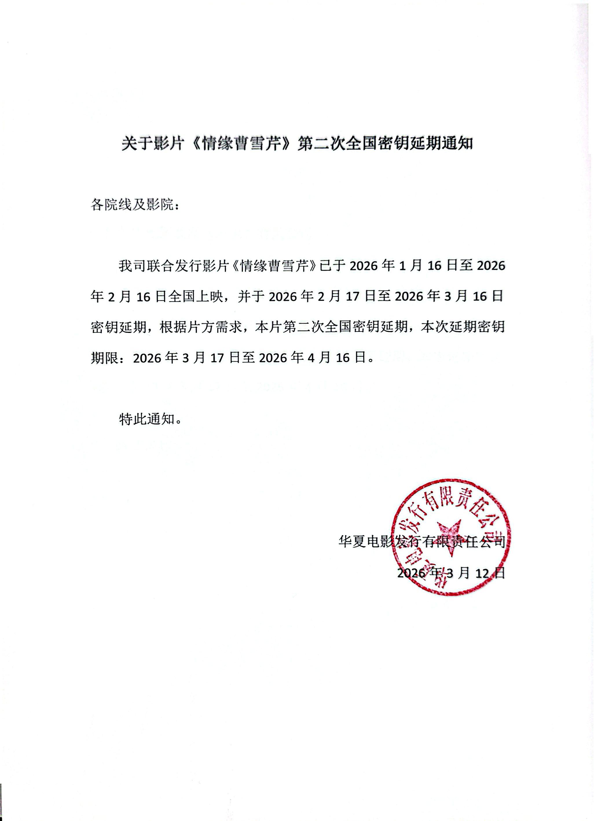 《情缘曹雪芹》发行通知