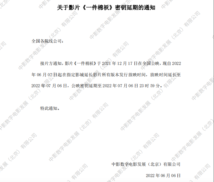 《一件棉袄》密钥延期的通知
