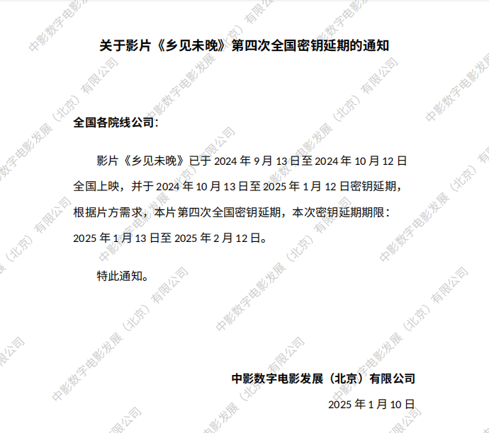 《乡见未晚》全国密钥延期及调整票房结算标准的通知