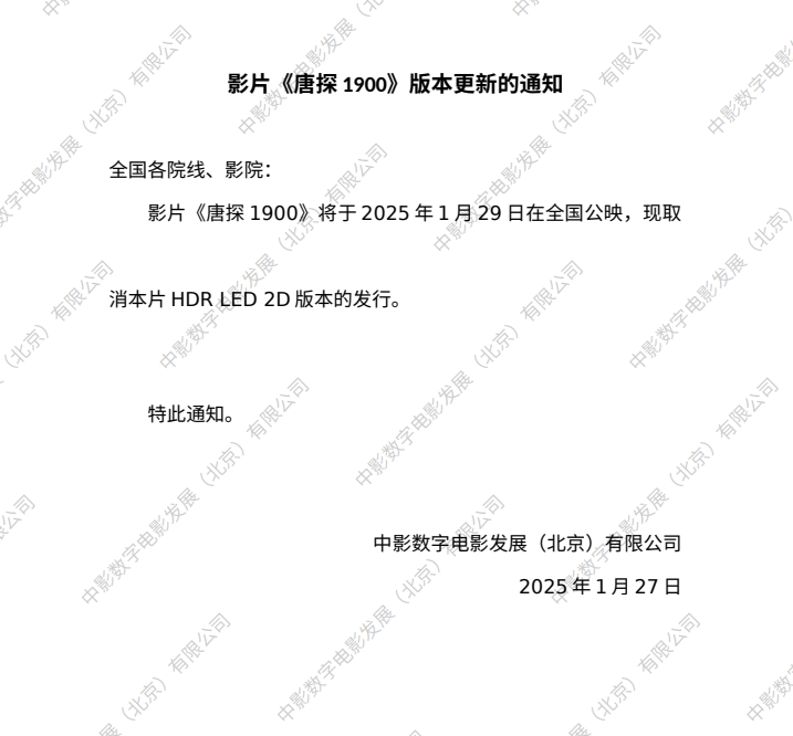 关于影片《唐探1900》二次密钥延期的通知