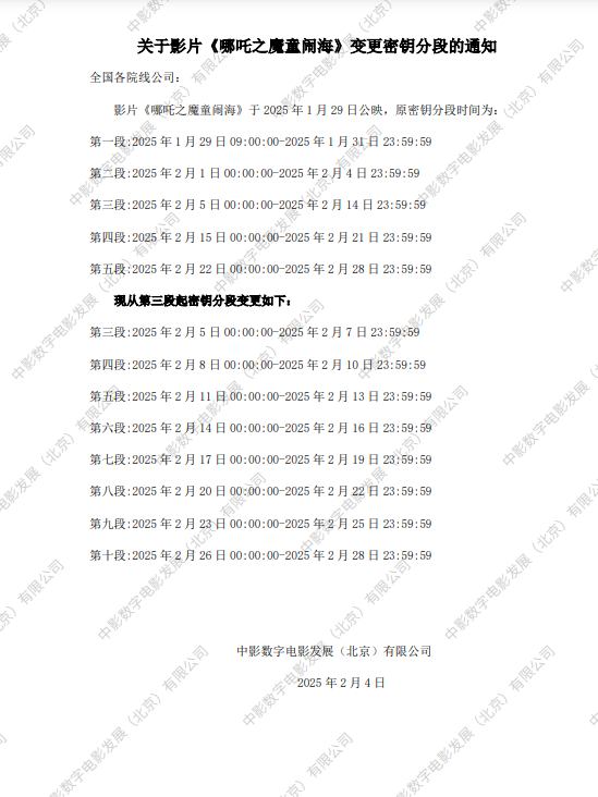 《哪吒之魔童闹海》第四次密钥延期的通知