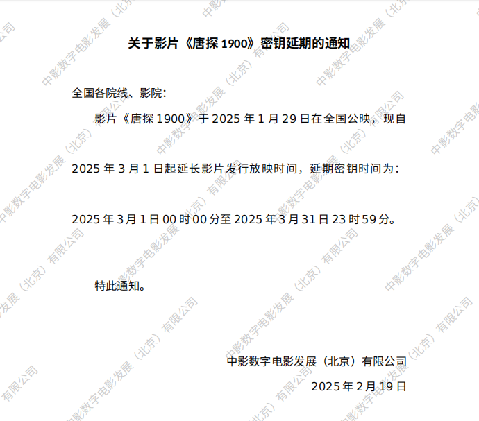 关于影片《唐探1900》二次密钥延期的通知