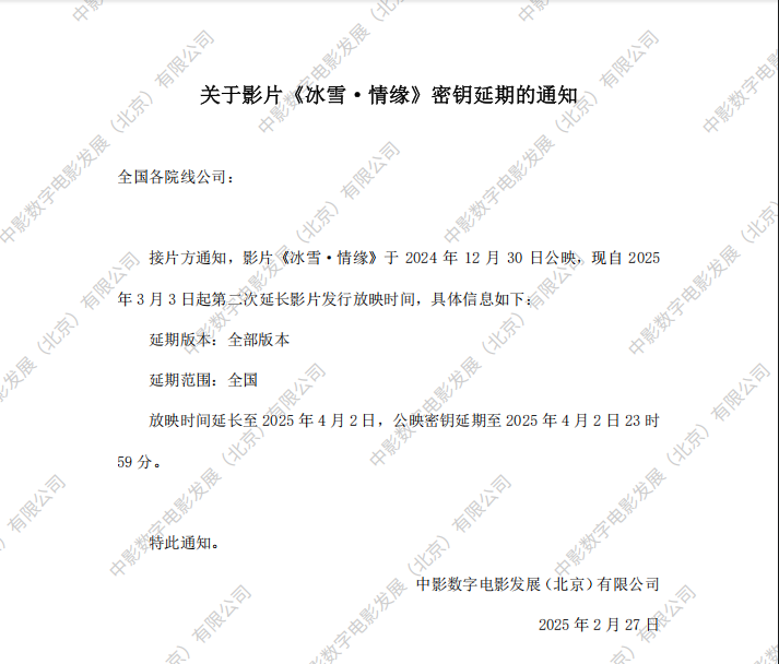 关于影片《冰雪·情缘》第八次密钥延期的通知
