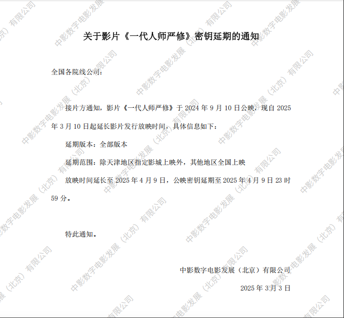 《一代人师严修》第三次密钥延期的通知