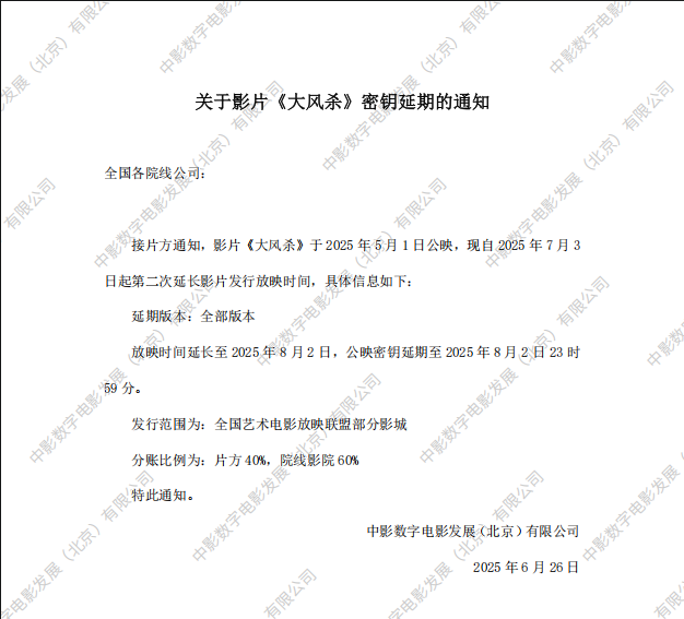 关于影片《大风杀》密钥延期及发行范围变更通知