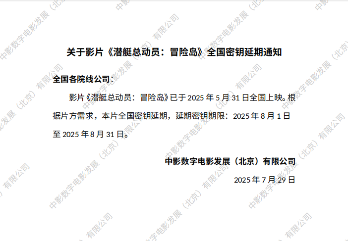 关于影片《潜艇总动员:冒险岛》密钥延期的通知