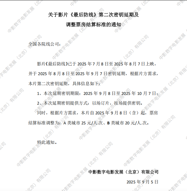关于影片《最后防线》第三次密钥延期及调整票房结算标准的通知