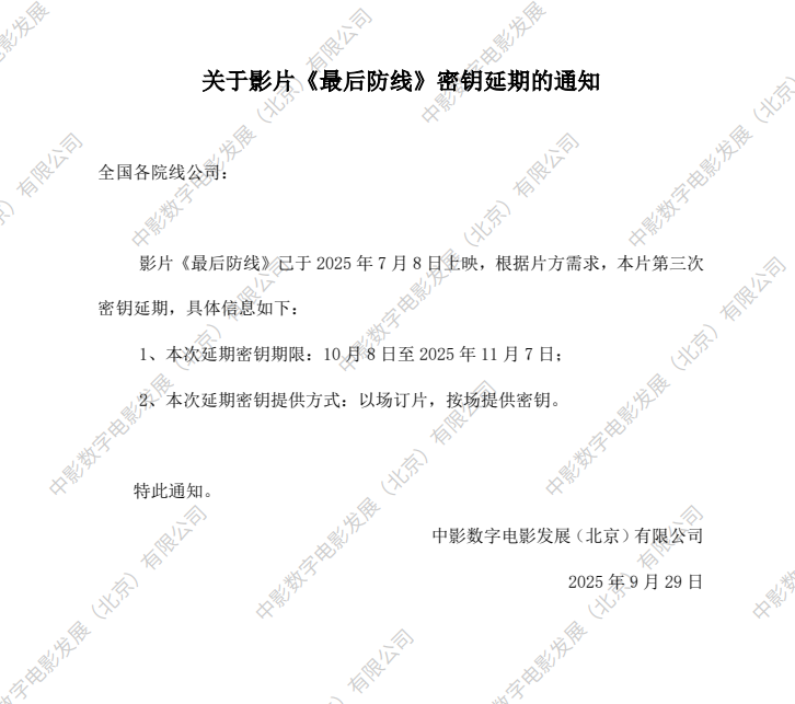 《最后防线》第二次密钥延期及调整票房结算标准的通知