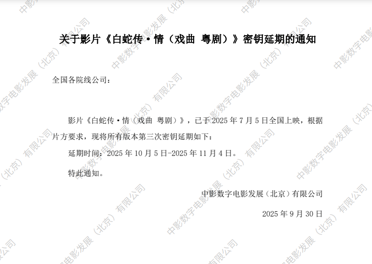 发行通知 » 关于影片《白蛇传·情(戏曲 粤剧)》第三次密钥延期的通知
