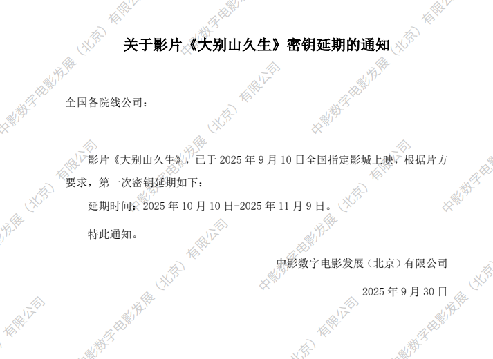 发行通知 » 关于影片《大别山久生》第一次密钥延期的通知