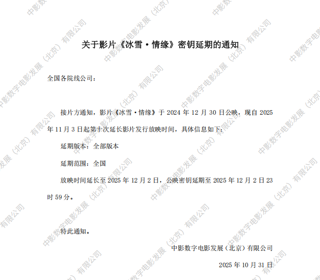 关于影片《冰雪·情缘》第八次密钥延期的通知