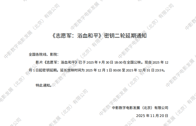 关于影片《志愿军:浴血和平》调整结算标准的通知