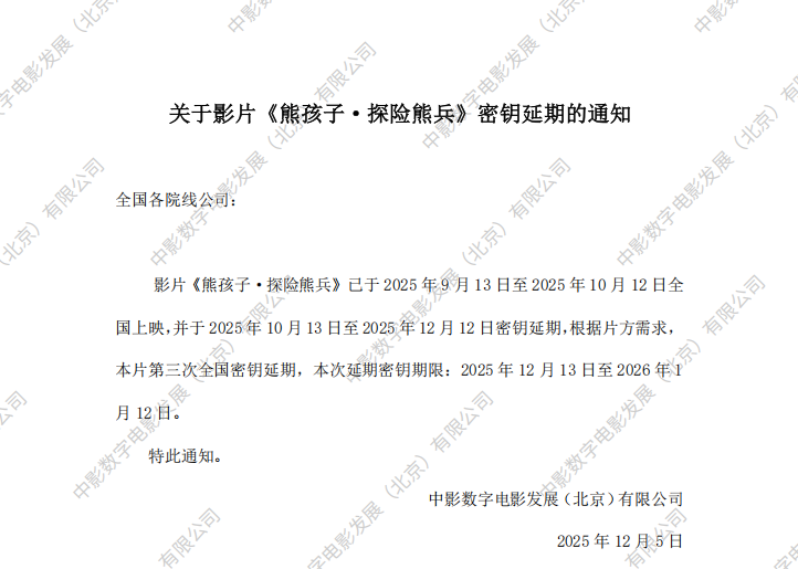 关于影片《熊孩子·探险熊兵》第一次密钥延期的通知