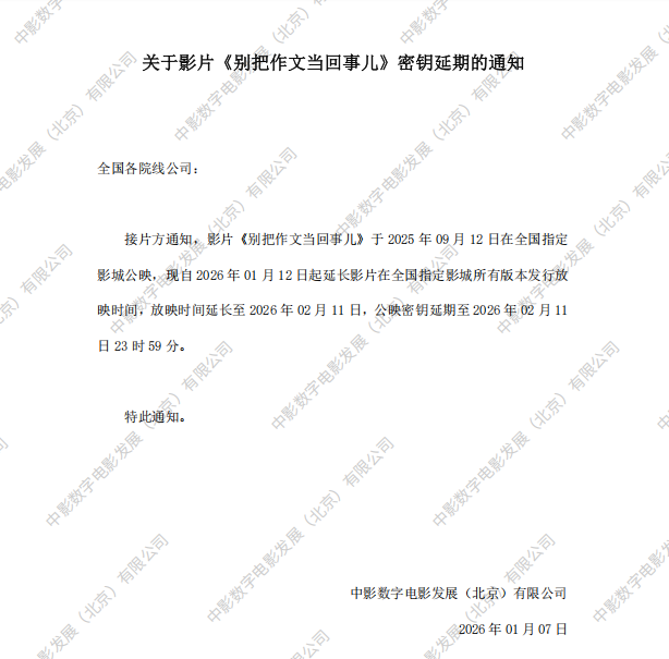 《别把作文当回事》密钥延期及调整影片票房结算标准的通知