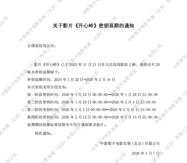 《开心岭》变更上映范围及密钥延期的通知