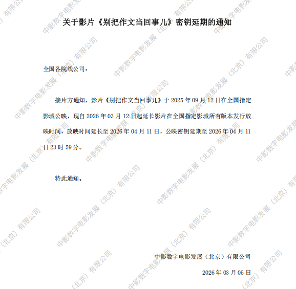 《别把作文当回事》密钥延期及调整影片票房结算标准的通知