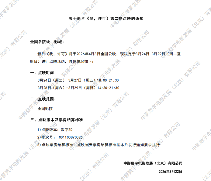 发行通知 » 《我,许可》第二轮点映的通知