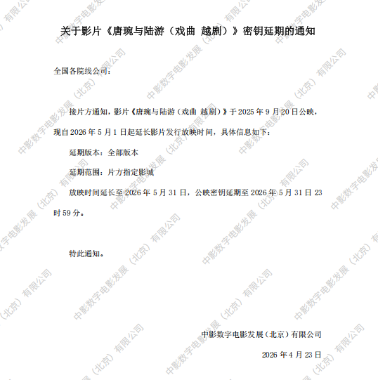 发行通知 » 《唐婉与陆游(戏曲 越剧)》第七次密钥延期的通知