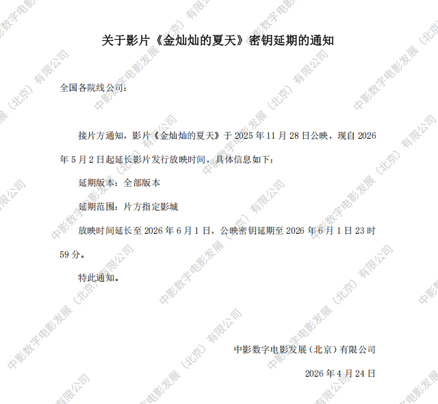 《金灿灿的夏天》第四次密钥延期的通知