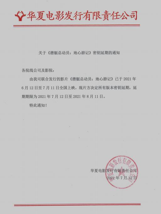 关于影片《潜艇总动员:地心游记》密钥延期的通知