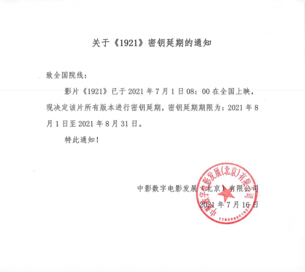 《1921》密钥延期通知