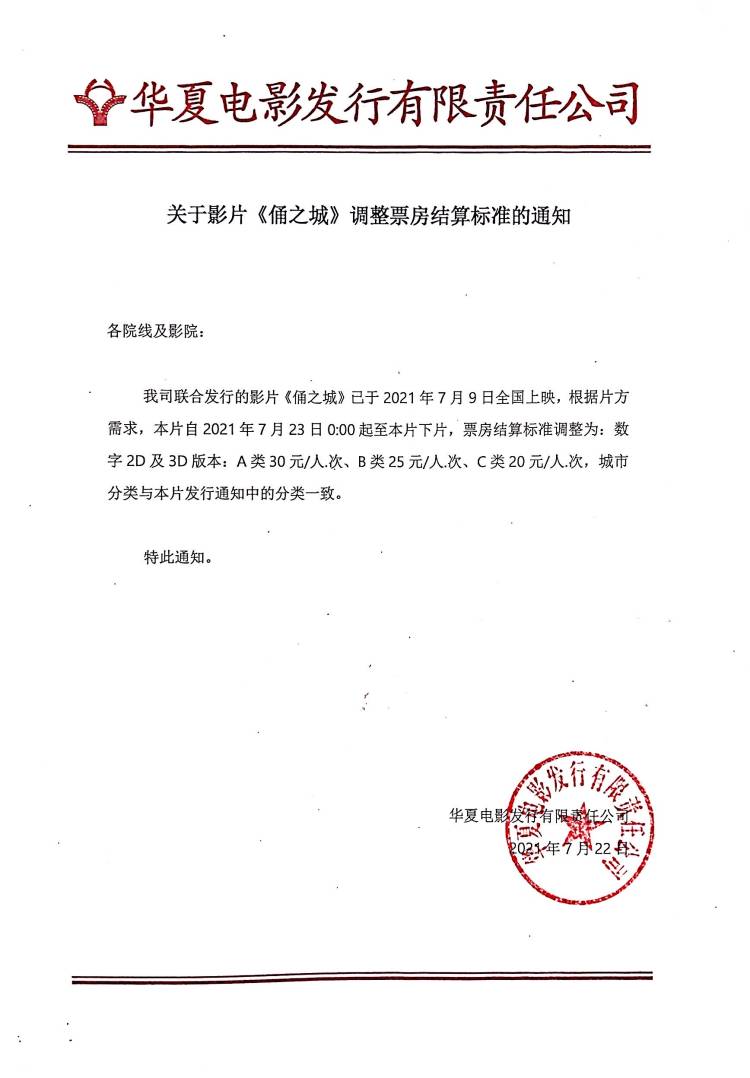 关于影片《俑之城》调整票房结算标准的通知