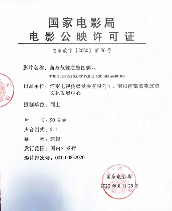 发行通知 » 《商圣范蠡之雄图霸业》公映许可证