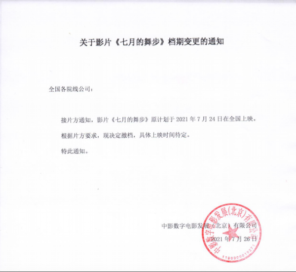 关于影片《七月的舞步》档期变更的通知