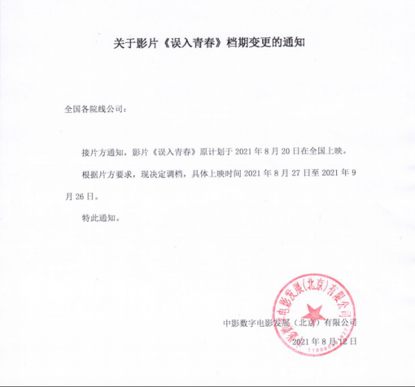 发行通知 » 《误入青春》档期变更通知