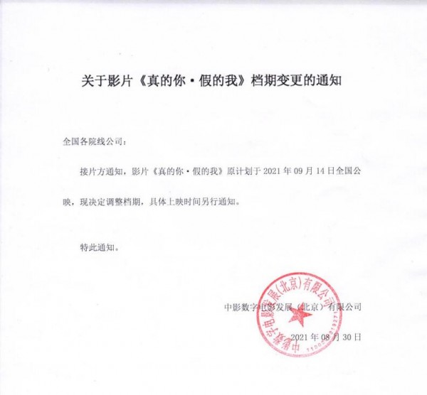 发行通知 » 关于影片《真的你·假的我》档期变更的通知