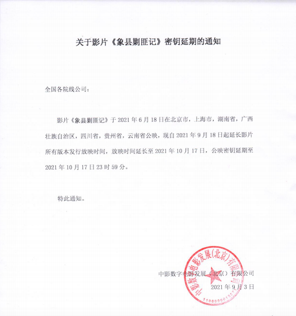 关于影片《象县剿匪记》密钥延期的通知