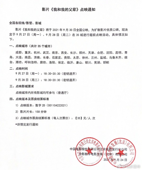 二十大展映影片《我和我的父辈》发行通知