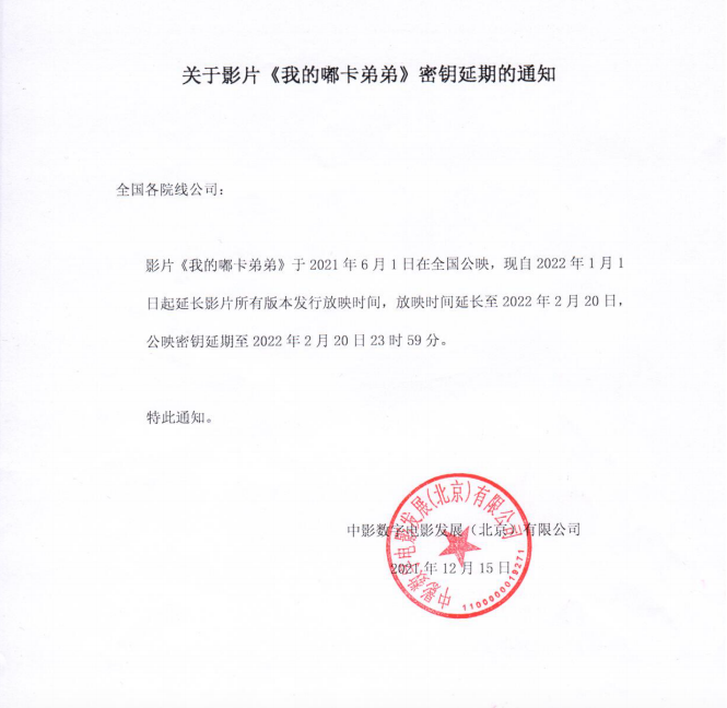 关于影片《我的嘟卡弟弟》密钥延期的通知